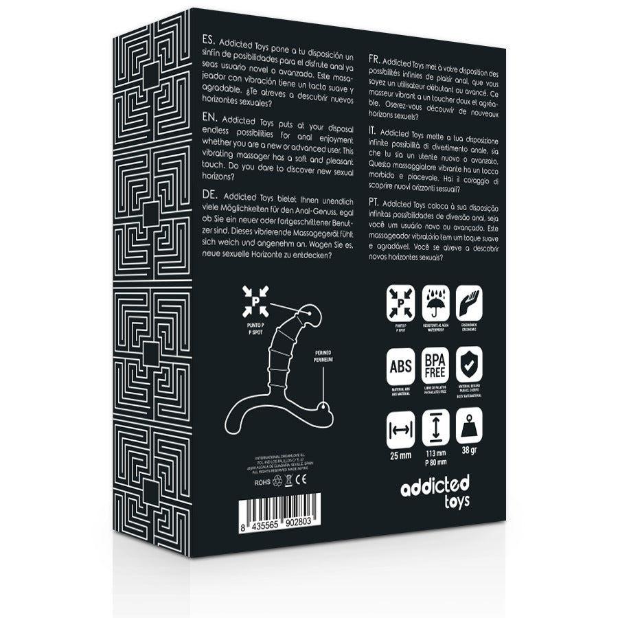 Scopri la stimolazione perfetta tra prostata, ano e perineo con il massaggiatore anale di Adicted Toys. La tecnologia innovativa di Adicted è il risultato di un'intensa ricerca del piacere sessuale condotta in collaborazione con urologi e sessuologi.